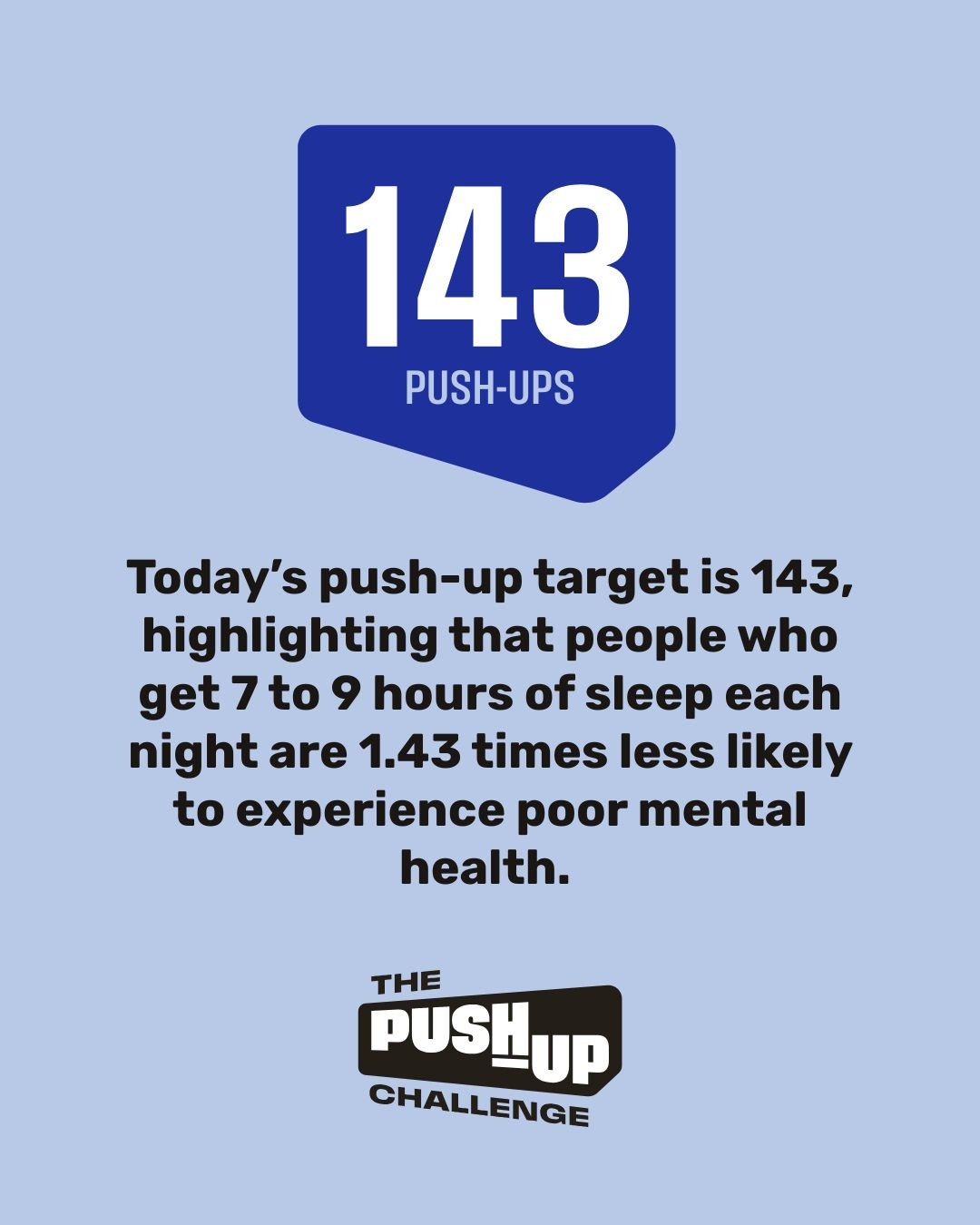 Today’s push-up target is 143, highlighting that people who get 7 to 9 hours of sleep each night are 1.43 times less likely to experience poor mental health.